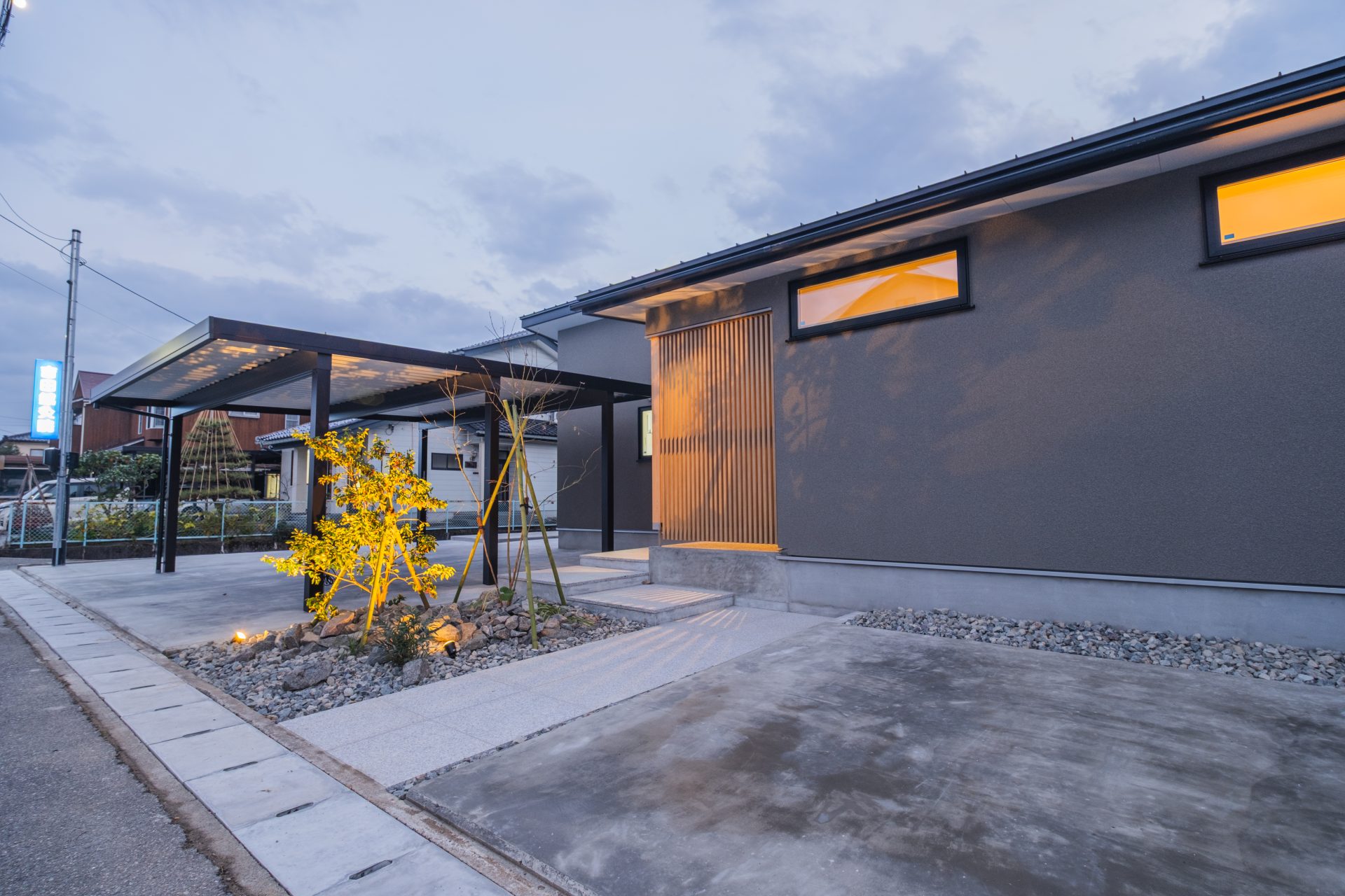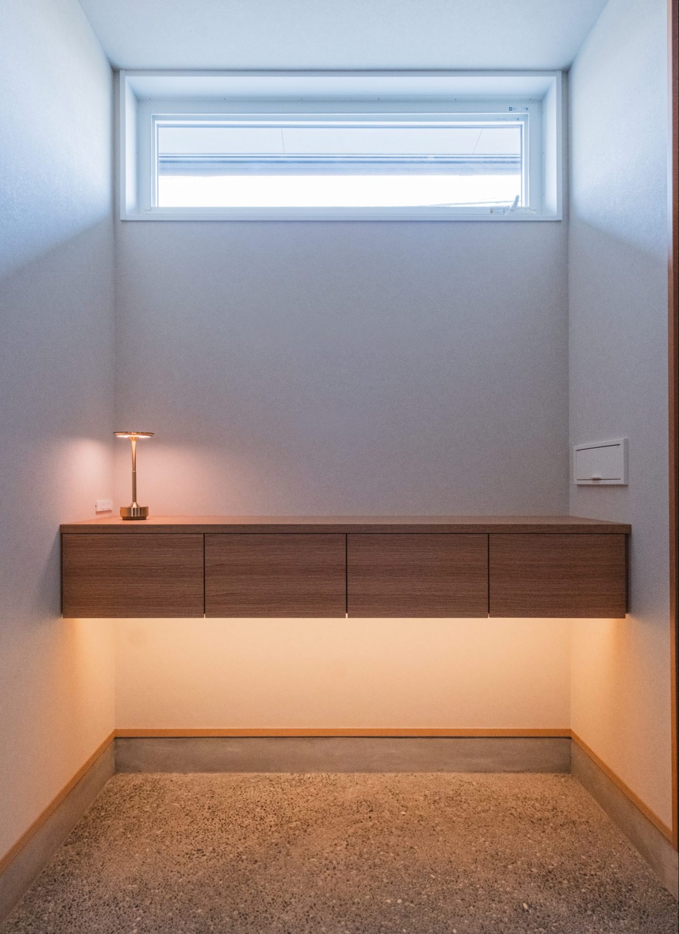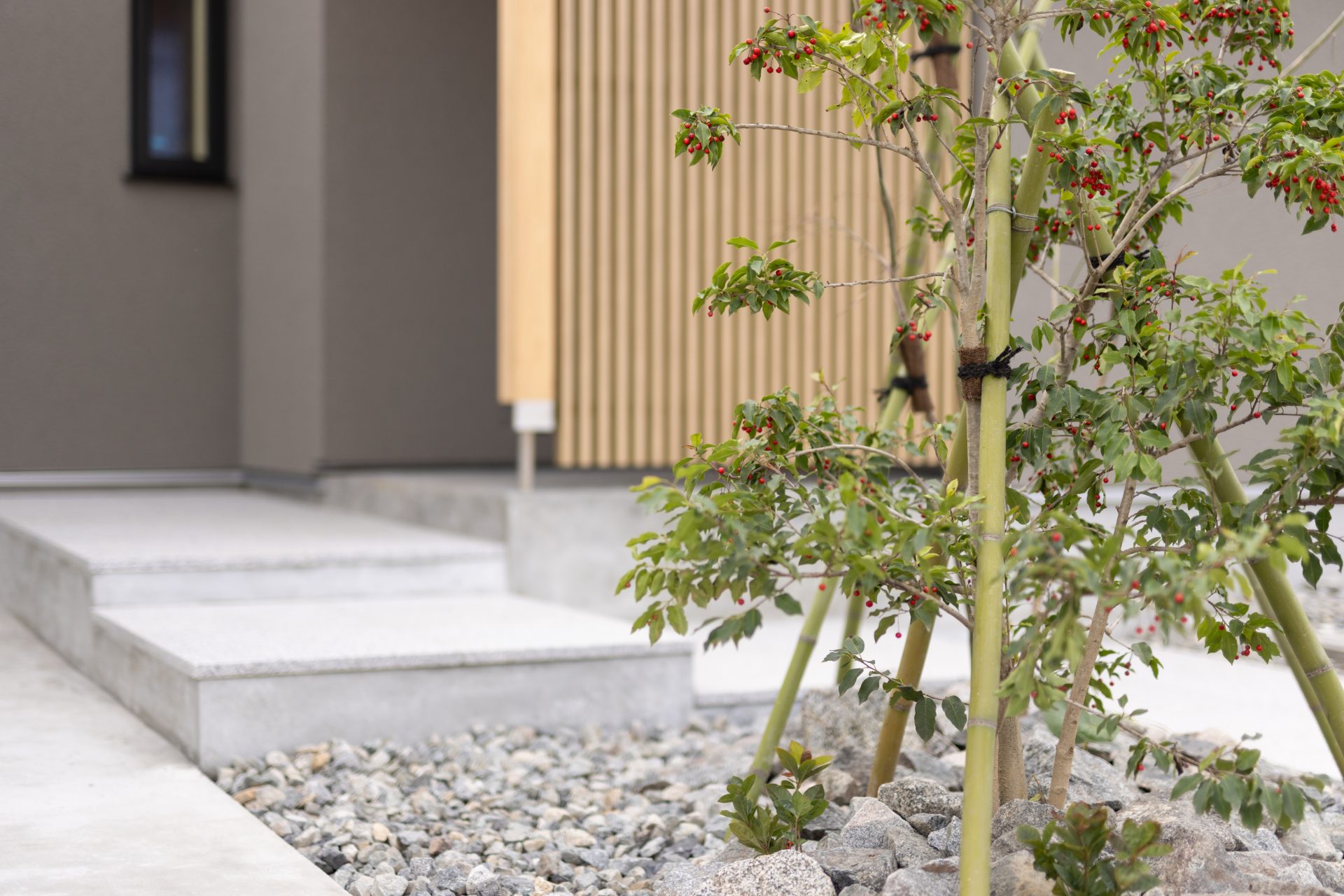 玄関、和室の造作家具、ナグリ加工の板畳、ポーチの洗い出し仕上げなど手仕事を感じられる仕上げを取り入れました。