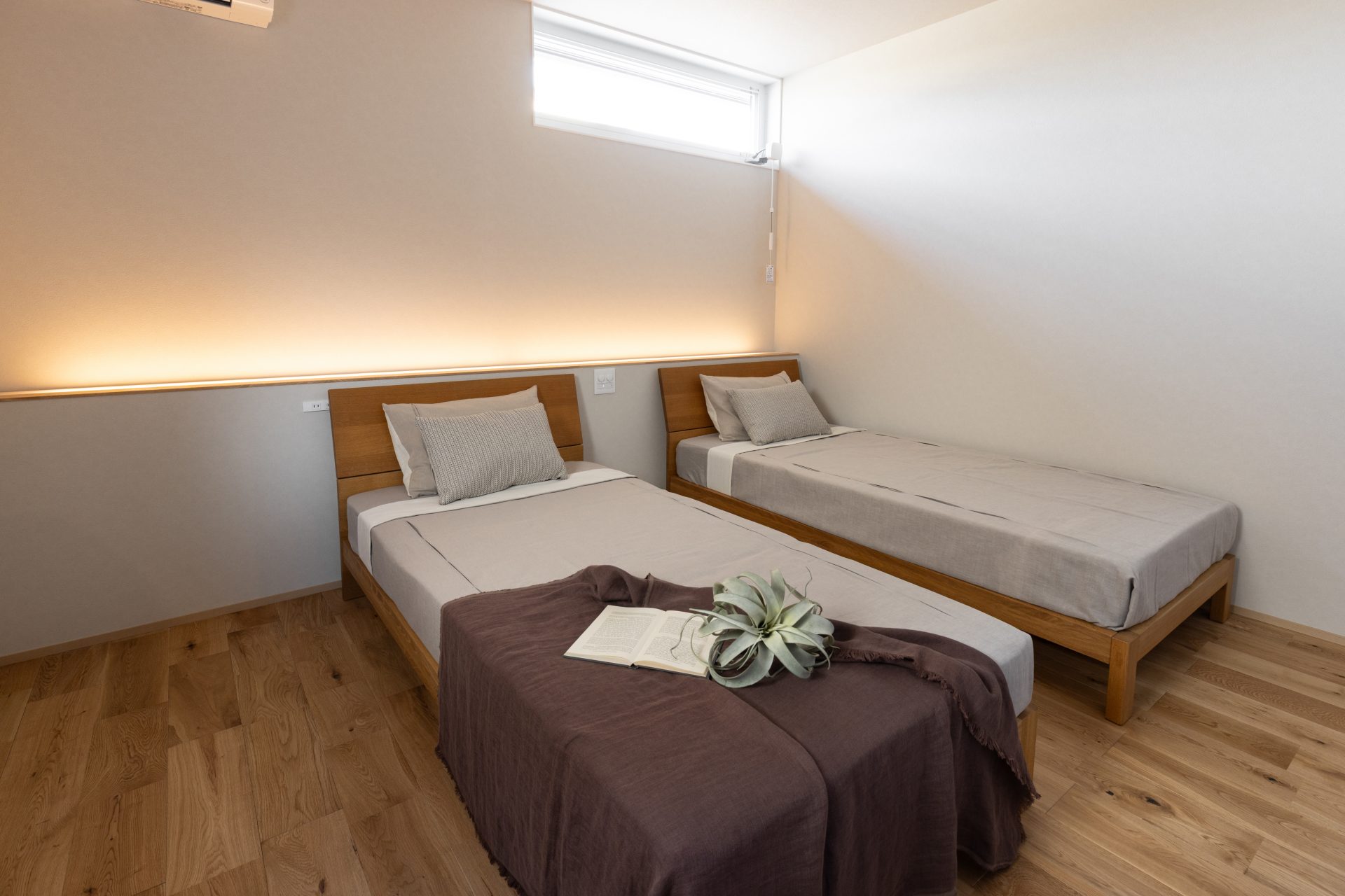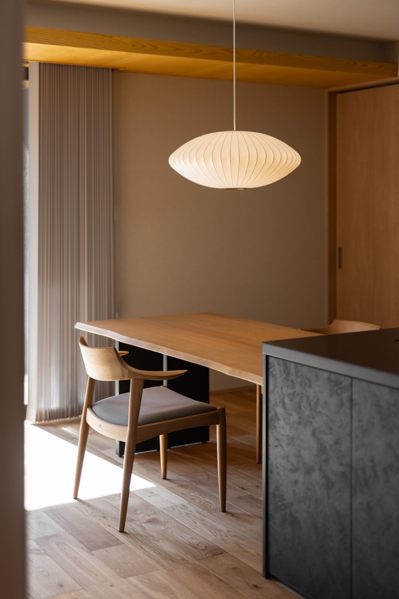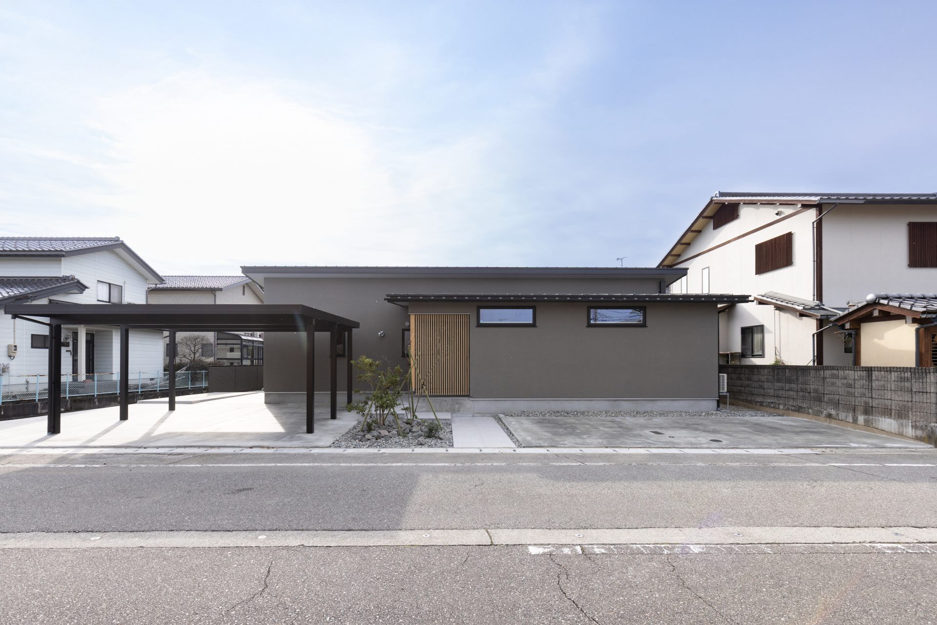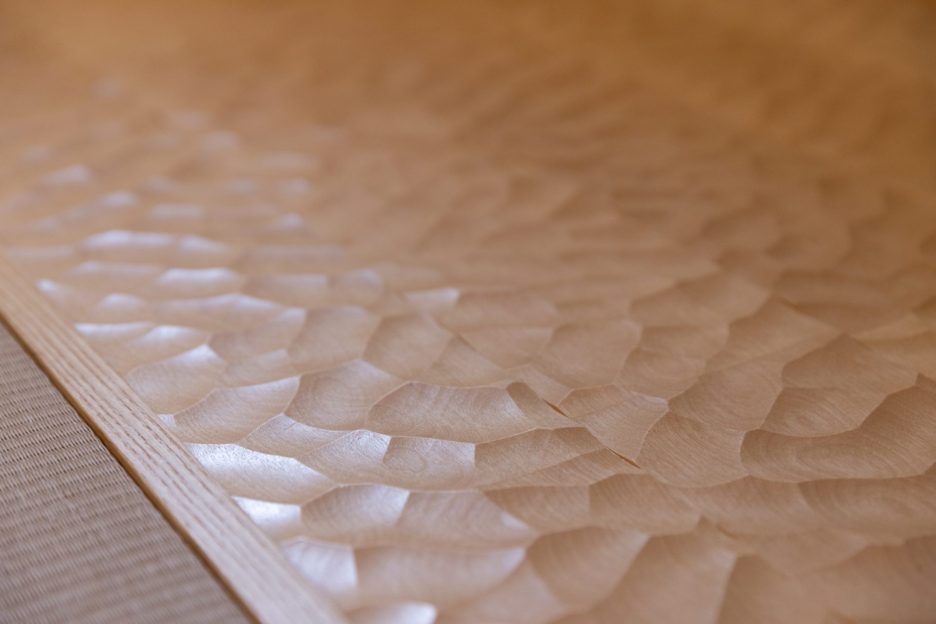 玄関、和室の造作家具、ナグリ加工の板畳、ポーチの洗い出し仕上げなど手仕事を感じられる仕上げを取り入れました。