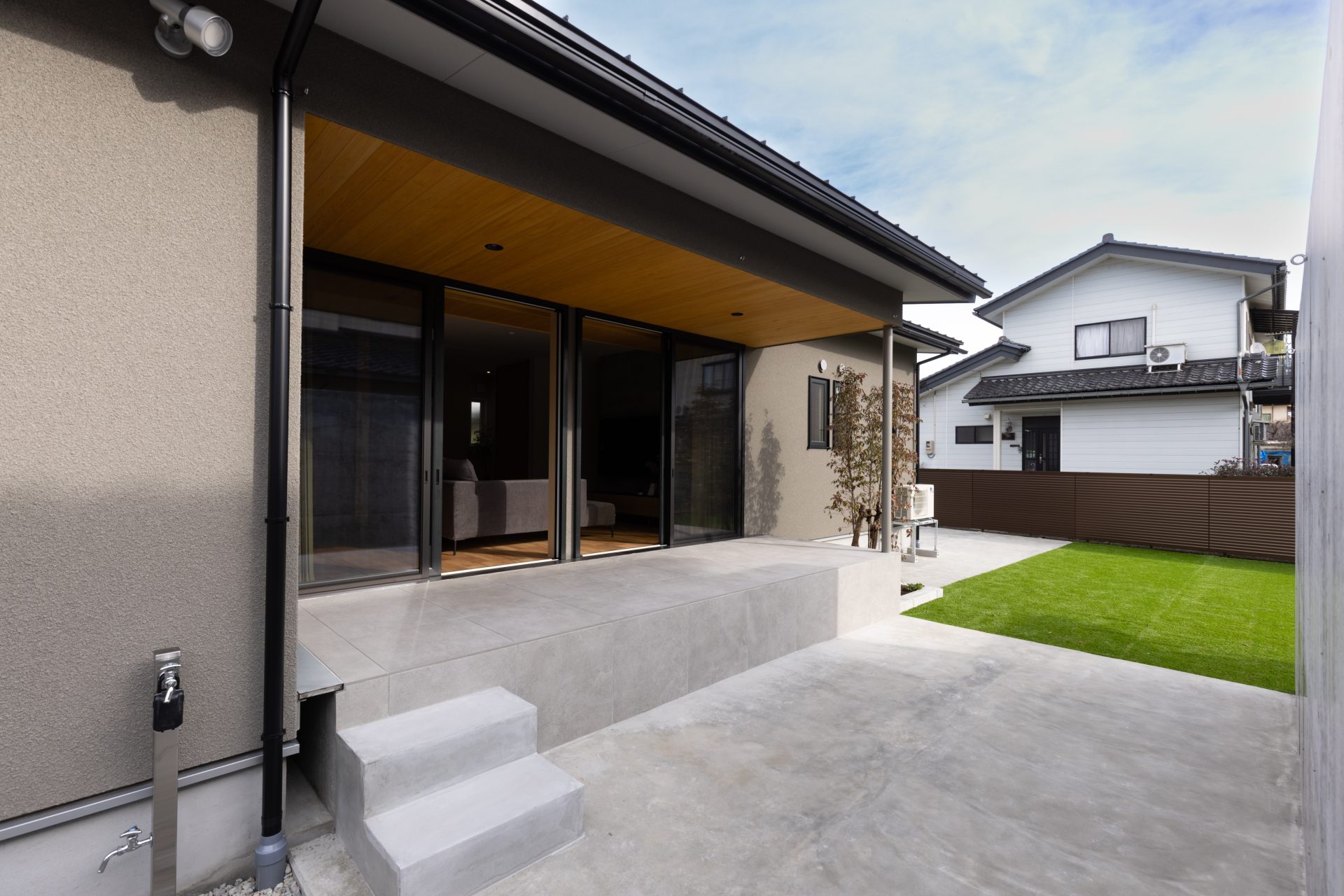 リビングからフラットに出入りのできるテラスを設けて中の暮らしが外へと滲み出てきます。